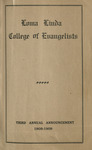 Third Annual Announcement of the Loma Linda College of Evangelists, Loma Linda, California, 1908-1909. The College of Evangelists would later become the College of Medical Evangelists, and then Loma Linda University.